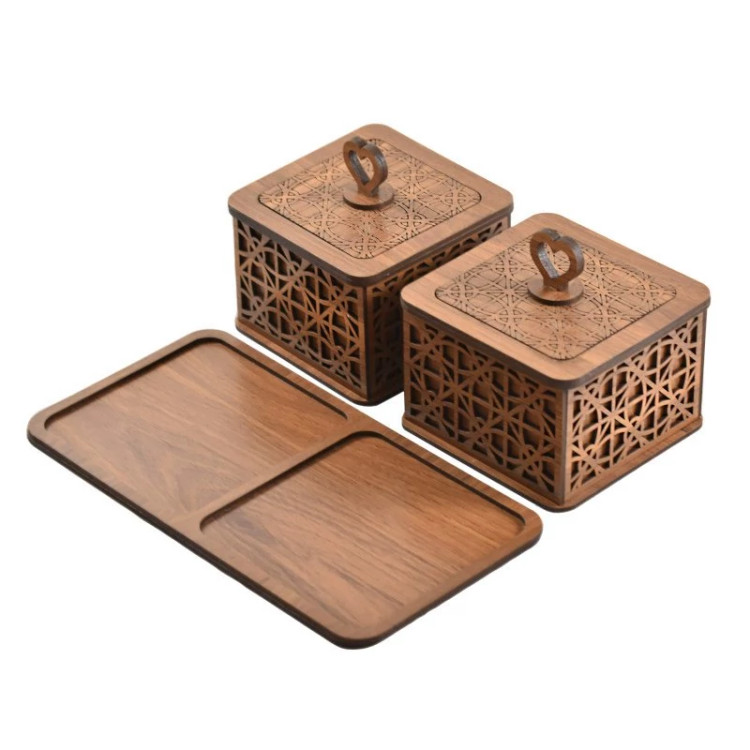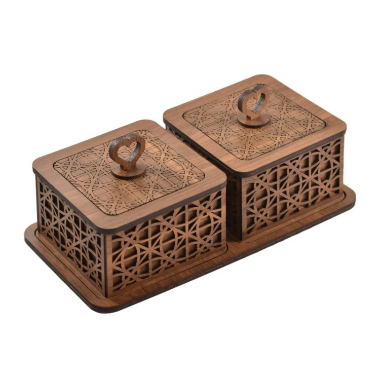 کالای فوق از جنس ام دی اف دو طرف روکش دار ساخته شده است دارای دو عدد قندان و یک عدد زیری می باشد - قابل استفاده برای قند و شکلات و ... می باشد