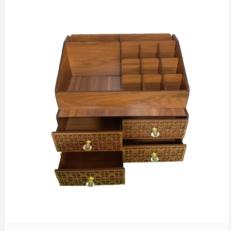 استند آرایشی رومیزی مناسب برای استفاده روزمره باقابلیت چیدمان تنوع بالایی از لوازم آرایشی و بدلیجات و اکسسوری دارای 4 کشو و قسمت های مختلف برای نظم دادن هرچه بیشتر مقاومت بالا و قابل استفاده برای سال های متمادی قابل حمل و قابل تمیز کردن با دستمال تر ارسال مطمئن به سراسر کشور چنانچه قصد استفاده در داخل کمد یا رومیزی با ابعاد محدود دارید حتما به ابعاد محصول توجه شود.